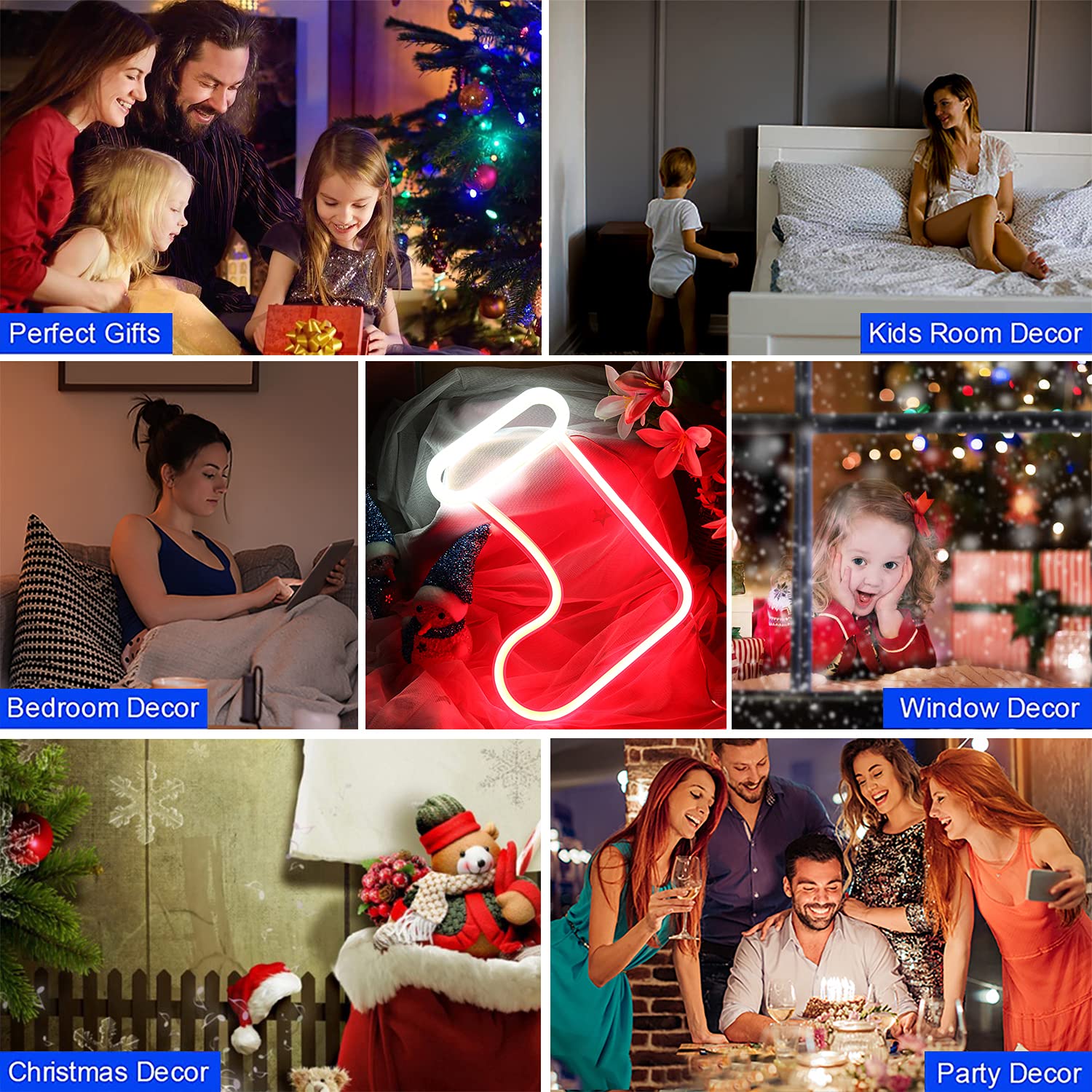 - ?Sweet and warm?Christmas stockings lights are very suitable for home decoration and wall art, creating a fun and lively atmosphere for your bedroom, living room, kitchen, and children's room. A wonderful neon sign replaced the boring desk lamp, adding warm colors to the darkest room. Add a special atmosphere to events such as birthdays, Christmas, marriage proposals, dinners, performances, weddings or any parties.