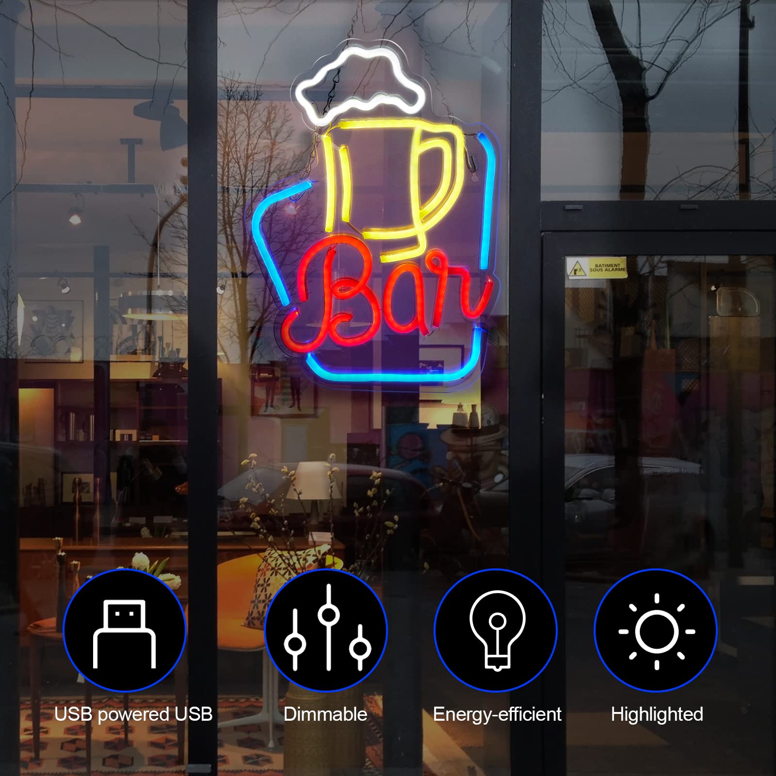 - ?Eye Catching and Stylish?The unique design of the bar sign create a fantastic atmosphere for bars, bistro, nightclubs or party. The bar neon sign with clear and even light will bring your guests an excellent impression.