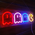 - Peculiar Design and Rainbow Colors:Ghost Neon signs are our independent innovation product.The design is inspired by the famous arcade games.The funny cartoon design ensures that your child will be fascinated by it.Ghost neon lights gives off warm red pink blue and yellow light,a wonderful neon game room decor to replace the boring desk lamp and add color to the boy game room.