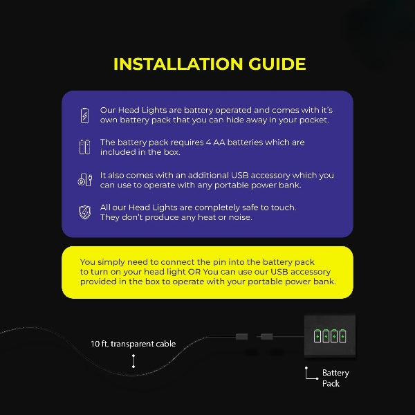 Head Light is an LED head band accessory by Neon Attack. It is battery operated and comes with it‘s own battery pack.