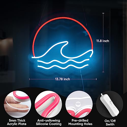 sunset &Sunrise Neon Sign, Sea Wave Sun LED Neon Light Sign Wall Decor, Battery Powered Ocean Surf Neon Sign for Living Room Bedroom Office Game Room Mancave Bar Cafe, Ice Blue/Red