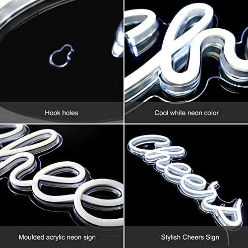 LED Neon Cheers Sign Light Up Letters Neon Sign for Home Bar Decor Moulded Acrylic Neon Light Wall Sign USB Operated with Switch Party Lights (Cool White)