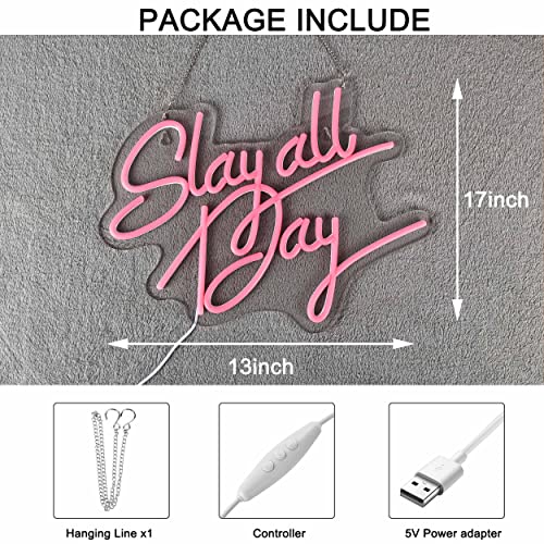 - Size and Power:The size of slay all day is about 17in (L) x 13in (W). Powered by a 5V low-voltage USB cord (5.9FT/1.8m) with dimmable switch, The brightness can be adjustable by you need. (Note: USB adapter is NOT included) .
