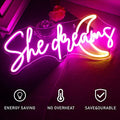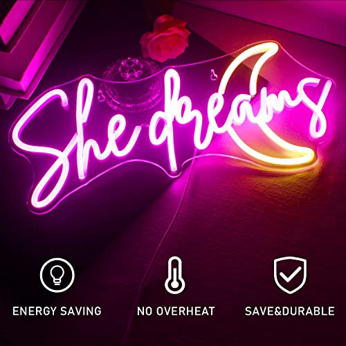 Details: She Dreams Neon Sign Led Pink Yellow Moon Neon Lights for Wall Decor Word Acrylic Light Up Signs for Bedroom Home Wedding Birthday Party Girls Gifts d